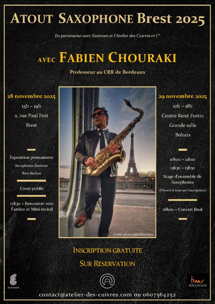 Le vendredi 28 et le samedi 29 novembre 2025 : rencontre autour du saxophone : exposition, stage, musique d’ensemble avec Fabien Chouraki et la marque Eastman